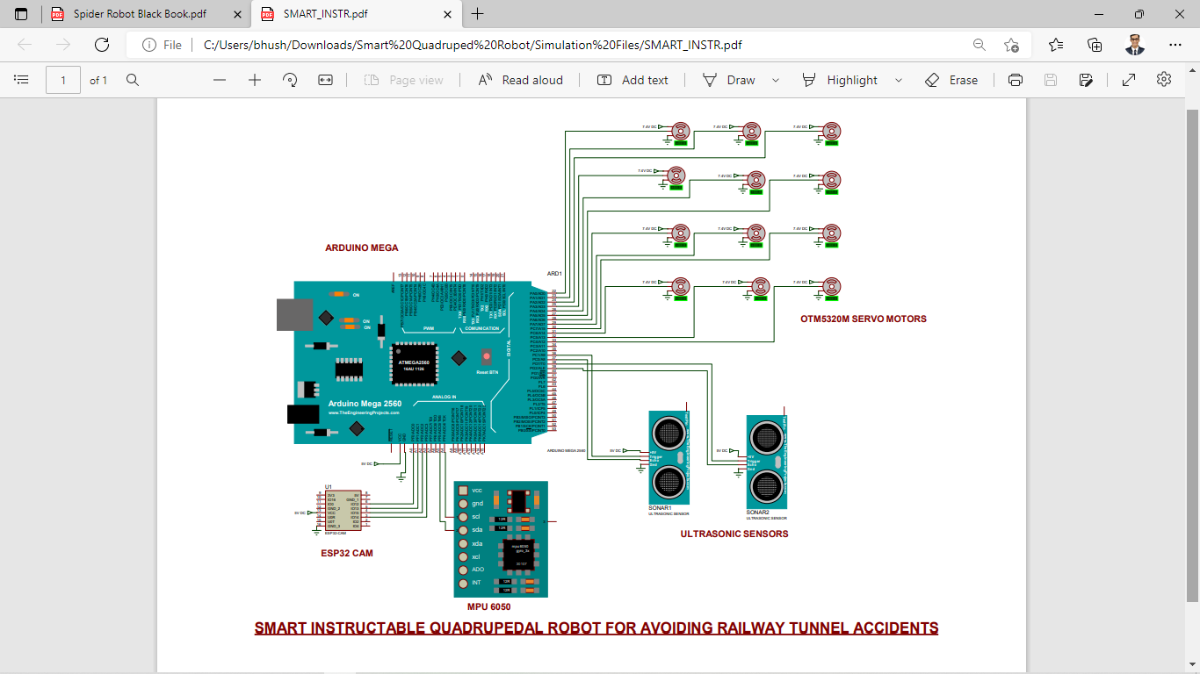 As shown in above simulation, the unit consist of Arduino MEGA as a main microcontroller and ESP 32 cam module. Power supply of constant DC 4.2V which is considered as Li-Po battery of same voltage. It also consists of Servo 12 motors which operate at 5V. which are connected to analog pins of NANO from PCA22 till PCA33.