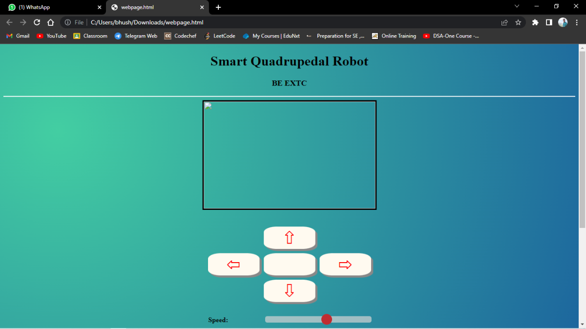 We have designed an interactive graphic user interface for this project using HTML and CSS language. This webpage is basically programmed inside our secondary microcontroller that is ESP 32 with which our smart device can connect through a Wi-Fi. This webpage will be responsible for showing us a live footage from the camera over the microcontroller which can be used as a surveillance purpose. Apart from that we are also able to control the movements of the robot in all direction using the provided joystick which is shown in following figure.