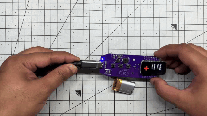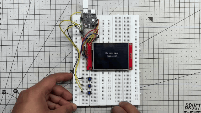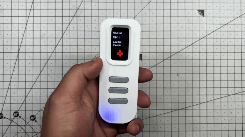At its core, Medic Mini runs on an ESP32-C6 paired with a 1.47" Waveshare display, housed inside a custom PCB and a 3D-printed enclosure I designed from scratch. The interface is clean and purposeful: users are prompted with one symptom at a time and respond using three tactile buttons—Yes, No, or Not Sure.