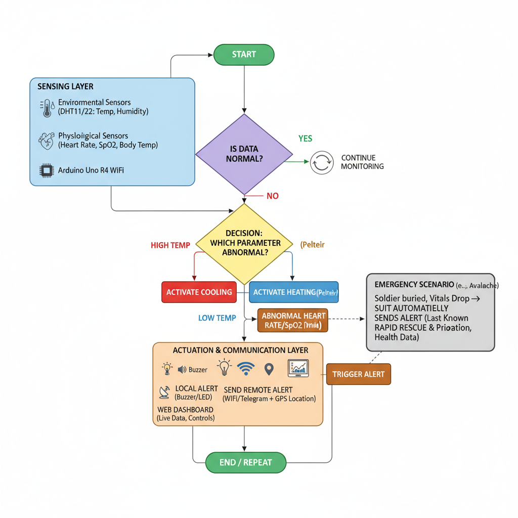 - Avalanche Rescue: A soldier is buried under snow. The suit detects abnormal vital signs and sends an emergency alert with GPS location to the command center. Rescue teams are dispatched immediately, guided by real-time health and location info.