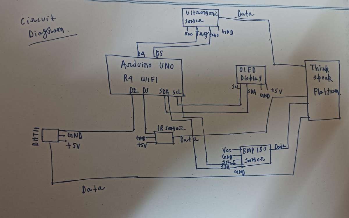 "AURA-6 (Arduino Unified Real-time Analytics) is an IoT-based multi-sensor monitoring system using Arduino R4 WiFi. It integrates a DHT11 sensor for temperature and humidity, an IR sensor for motion detection, a BMP180 sensor for pressure and altitude, and an ultrasonic sensor for distance measurement. The system collects and transmits real-time data to ThingSpeak for cloud storage, visualization, and analysis."