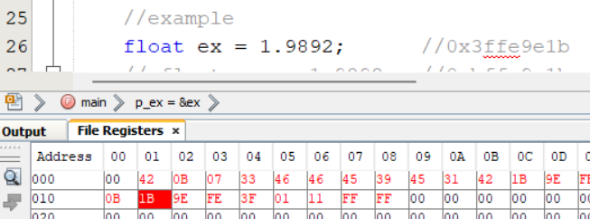 Each entry in the array xx holds a single byte. The pointer p_ex points to the lowest byte of the floating point number ex.