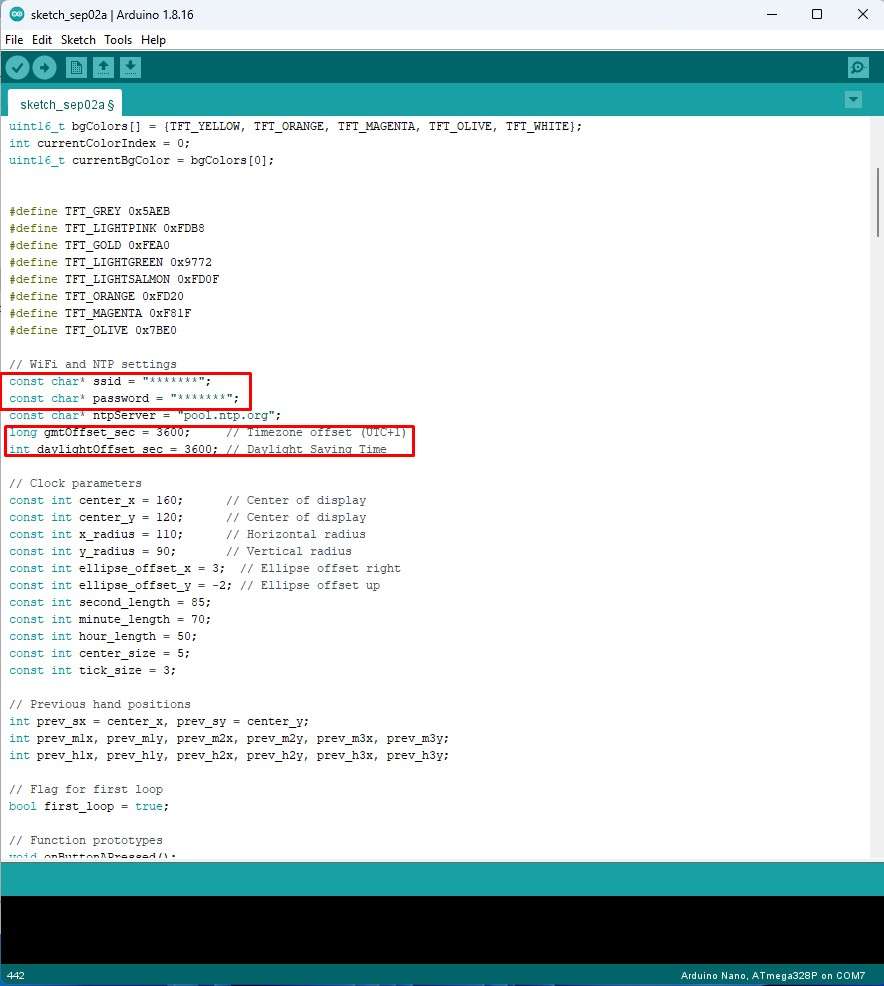 At the beginning you need to enter your Wi-Fi credentials, the time zone you live in and Daylight Saving Time. Then the code is divided into several separate, easy-to-understand functions in which you can change various parameters and, if you have the time and desire, create your own clockfaces.