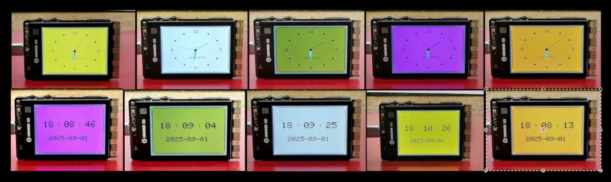 The clock contains a colored arrow for showing hours, an empty arrow for minutes and a thin red arrow for seconds. The date is written in the lower part. Now by pressing the A button, the next screen appears, which displays the time and date in digital format. With the B button, we can change several previously defined colors for the clock background.